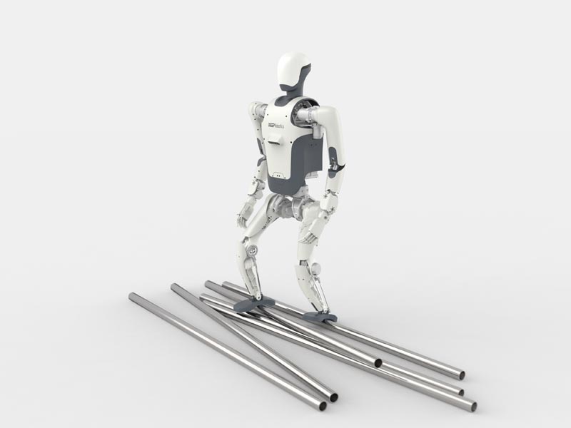 基于强化学习智能算法,在路面打滑和外部推力干扰等未知扰动下,可快速恢复平衡并保持稳定行走。行走速度大于1.6米/秒,可上下18厘米台阶,25°斜坡和随机起伏地形,可实现户外长距离运动。
